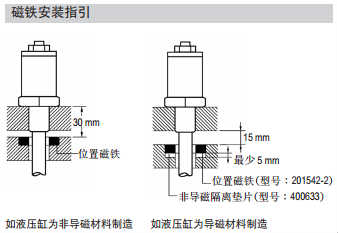 位置磁鐵 - 為了保證測量的精確性,位置磁鐵的安裝支架必須用非導磁材料製造(如螺絲、隔離墊片與支撐等)。關(guān)于磁鐵的正確安裝與尺寸要求,請參考下圖的磁鐵安裝指引。