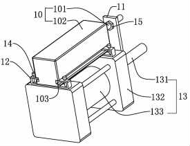 連接片11兩端分別設(shè)有通孔,拉桿101與氣缸13外部的活塞桿131的端部分別設(shè)有外螺紋,拉桿101與氣缸13外部的活塞桿131分別穿過連接片11的通孔,并用墊片和螺栓15將拉桿101與活塞桿131固定在連接片11的兩端。