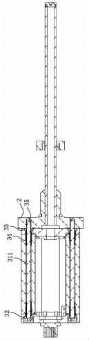 圖3示出了本實(shí)施例的磁致伸縮位移傳感器的剖切面,標(biāo)記同圖1和圖2中相對(duì)應(yīng),可以看到,空心螺帽34與前蓋32、圓柱體狀空心部311、后蓋33之間的螺紋,以及螺柱35與連接基座2的螺紋,優(yōu)選的,所述連接基座2的螺紋部長(zhǎng)度大于連接基座厚度的一半,可以使連接更牢固。