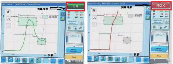 在發(fā)動機的裝配線中,有需要將活塞壓入活塞套的的工序,因為需要精密安裝,要記錄活塞被壓入活塞套的力和位移曲線,并通過設(shè)置的參數(shù)判定壓入過程是否良好,如下圖: