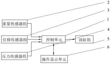 圖中:1-控制單元;2-重量傳感器組;3-磁致伸縮位移傳感器組;4-壓力變送器組;5-油缸組;6-操作顯示單元。