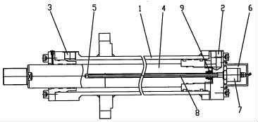 其中:1、油缸,2、油口 A,3、油口 B,4、活塞桿,5、內孔,6、磁致伸縮位移傳感器,7、傳感器頭,8、傳感器導桿,9、磁環(huán)。