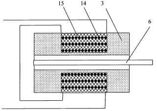 如圖1-圖3所示,低噪聲磁致伸縮位移傳感器包括外殼9和磁鐵組件8,外殼9內(nèi)裝有骨架3、固定塊12、波導(dǎo)絲6、激勵導(dǎo)線2、返回導(dǎo)線11、線圈組件5、屏蔽器4和測量電路13 ;所述骨架3、固定塊12分別固定于外殼9內(nèi)壁的兩端;所述骨架3上設(shè)有內(nèi)孔,線圈組件5繞設(shè)于所述骨架3的內(nèi)孔外周,并電氣連接測量電路13,屏蔽器4套設(shè)于線圈組件5外周;波導(dǎo)絲6的一端為近端,另一端為遠(yuǎn)端,其近端安裝于骨架3的內(nèi)孔中,并經(jīng)激勵導(dǎo)線2電氣連接測量電路13,其遠(yuǎn)端安裝于固定塊12上,并經(jīng)返回導(dǎo)線11電氣連接測量電路13 ;磁鐵組件8活動安裝于外殼9的外壁上,并能沿外殼9的軸向移動;所述波導(dǎo)絲6外周套設(shè)有保護(hù)套管7,保護(hù)套管7的一端與骨架3固接,另一端與固定塊12固接;波導(dǎo)絲6的遠(yuǎn)端裝有阻尼器10 ; 所述外殼9的外壁裝有法蘭1,法蘭1電氣連接測量電路13 ;其特征在于:屏蔽器 4(參見圖2、是外周套設(shè)有鐵磁保護(hù)套17的圓環(huán)形永久磁鐵16 ;所述線圈組件是差動式線圈,該差動式線圈(參見圖幻由兩個圓環(huán)形繞組14、15組成,兩個圓環(huán)形繞組14、15 的規(guī)格尺寸及匝數(shù)相同,而且兩個圓環(huán)形繞組14、15的繞線纏繞方向相反;差動式線圈的兩個圓環(huán)形繞組14、15反向串聯(lián)后接入測量電路,兩個圓環(huán)形繞組14、15的繞層沿波導(dǎo)絲6的徑向交替層疊;