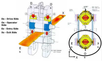 實(shí)施技術(shù)改造的軋機(jī)機(jī)架包括驅(qū)動(dòng)側(cè)DS和操作側(cè)OS兩套壓下輥縫控制裝置。