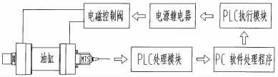 磁致伸縮位移傳感器全稱為磁致伸縮型直線位移傳感器,它安裝在油缸的內(nèi)部,當油缸伸縮時會發(fā)出4~20mA的信號輸出,這個信號的大小與行程成正比。磁致伸縮位移傳感器油缸的控制原理圖見圖3,具體流程為:油缸伸縮時會發(fā)出與行程大小相對應的4~20mA的電信號輸出,該信號傳輸?shù)絇LC的處理模塊,將電信號轉(zhuǎn)化為相應的行程值,該值通過PC軟件程序處理,當該值達到程序預先設定的值時,PC會向PLC的執(zhí)行模塊發(fā)出油缸停止的信號,該信號控制電源繼電器的斷電操作,電源繼電器控制MTS油缸的液壓電磁控制閥的斷電操作,從而控制了油缸的停止操作。