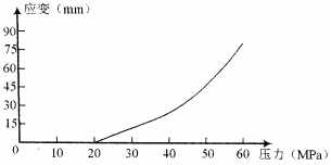 經(jīng)過大量的實(shí)驗(yàn)數(shù)據(jù)分析,得到模具及其支承座受壓力與應(yīng)變量的典型關(guān)系曲線如圖4所示,呈近似非線性關(guān)系,當(dāng)壓力<20 MPa時(shí),幾乎沒有應(yīng)變;當(dāng)壓力超過20MPa時(shí),模具及其支承座應(yīng)變量與壓力近似線性關(guān)系,壓力為30Mpa時(shí),應(yīng)變量為13mm;壓力為40Mpa時(shí),應(yīng)變量為27mm;壓力為50Mpa時(shí),應(yīng)變量為45mm。最后獲得模具及其支承座應(yīng)變量隨壓力變化的擬合公式如式(1)所示: