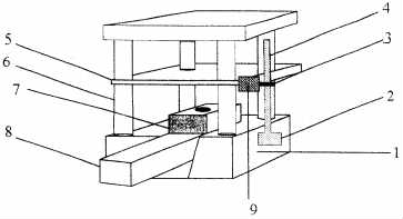 [實(shí)施方式]欠壓量的檢測原理圖如圖1所示,水平移動(dòng)工作臺8將模具支承座7送入,位移傳感器測頭2固定于水壓機(jī)立柱的限程套1上,位移傳感器的活動(dòng)磁環(huán)3通過連接裝置9與活動(dòng)橫梁5相連,并通過波導(dǎo)管4與傳感器測頭2相連。當(dāng)模鍛水壓機(jī)模鍛加工時(shí),活動(dòng)橫梁5沿水壓機(jī)立柱6向下運(yùn)動(dòng),開始是空程,當(dāng)上模具和下模具接觸時(shí),進(jìn)入工作行程,給活動(dòng)橫梁5加壓,使模鍛件變形,獲得模具成型的鍛件,完成工作行程。此后活動(dòng)橫梁5進(jìn)入返程,沿水壓機(jī)立柱6向上運(yùn)動(dòng),最后停止,可停靠在操作空間中任意位置。工作行程內(nèi)活動(dòng)磁環(huán)3跟隨活動(dòng)橫梁5向下移動(dòng)一定距離,活動(dòng)磁環(huán)3與波導(dǎo)管4形成的相交磁場產(chǎn)生的應(yīng)變脈沖信號返回磁致伸縮位移傳感器測頭2,檢測出活動(dòng)磁環(huán)3在工作行程內(nèi)移動(dòng)的精確距離,將此距離與模鍛件加工設(shè)定的距離比較計(jì)算得到模鍛件的欠壓量。