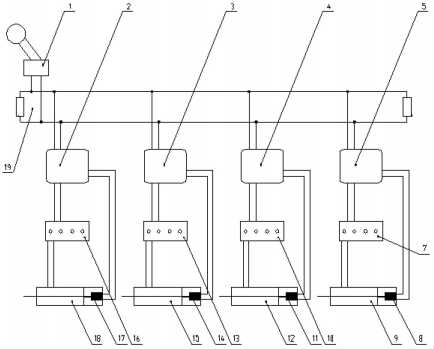 圖中:1、控制手柄,2、控制器,3、控制器,4、控制器,5、控制器,7、多路閥,8、磁致伸縮位移傳感器,9、頂升油缸,10、多路閥,11、磁致伸縮位移傳感器,12、頂升油缸,13、多路閥,14、磁致伸縮位移傳感器,15、頂升油缸,16、多路閥,17、磁致伸縮位移傳感器,18、頂升油缸,19、CAN總線。