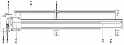 1:主支架, 2:光柵尺,3:步進(jìn)電機(jī),4:傳感器安裝平臺,5:磁致伸縮位移傳感器, 6:移動平臺,7:絲桿,8:精密導(dǎo)軌