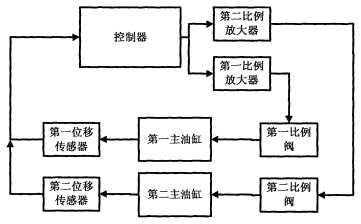 —種雙油缸同步控制系統(tǒng),其特征在于,包括第一主油缸、第二主油缸、控制器、第一磁致伸縮位移傳感器、第二磁致伸縮位移傳感器、第一比例放大器、第二比例放大器和第一比例閥和第二比例閥;第一比例放大器的輸出端、第一比例閥和第一主油缸的控制端依次串接;第二比例放大器的輸出端、第二比例閥、第二主油缸的控制端依次串接;第一磁致伸縮位移傳感器和第二磁致伸縮位移傳感器分別設(shè)置在第一主油缸和第二主油缸上;第一位磁致伸縮位移傳感器和第二磁致伸縮位移傳感器的信號(hào)輸出端均連接控制器的輸入端口;第一比例放大器和第二比例放大器的輸入端均連接控制器的輸出端口。